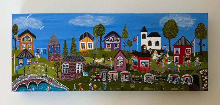 Blomsterbyen er titlen på dette maleri. Det er malet på lærred og sat i en speciallavet ramme. Det måler 20 x 40 cm. Solgt