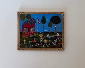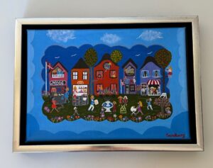 Fællessang – hvem husker ikke nedlukningen under Corona epidemien – hvor fællessangen gav et lyspunkt. På dette maleri synges der af livets lyst. Det måler 24 x 30 cm, det er malet på læred og er i special fremstillet ramme. Udloddet til Naivistisk kunstforening