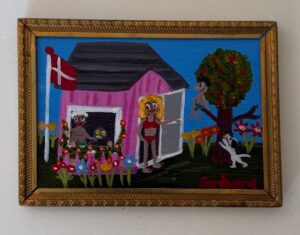 På ferie ved farmor. Hvem husker ikke de dejlige ferier på besøg ved bedsteforældre – hvor der var ekstra forkælelse. Malet på plade og sat i gammel ramme. Måler ca. 13×13 cm. Solgt,
