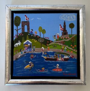 På tur med Åfarten ved odense å. Hygge og dejlig stemning ved bredden af Odense Å. Billedet måler ca. 13 x 18 cm – er malet på masonit og sidder i en fin gammel ramme. Solgt.