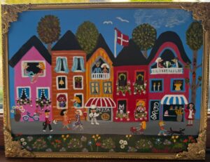 Billedet forestiller en gade – måske fra byen hvor jeg bor – cafebesøg, en vinhandel og lidt kongelige har man vel lov at være 🙂 Billedet måler ca 12 x 16 cm og er malet på masonit og sat i en fin gammel ramme. Solgt